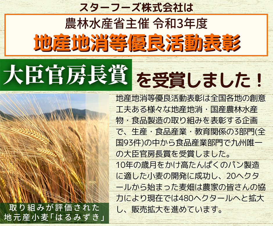 生産者のみなさんと共同して、小麦品種「はるみずき」の高タンパク質化と生産拡大に取り組み、宇佐市産の小麦を使ったパンやピザ生地等の製品からなる「南の大地」シリーズのブランド化を進めています。